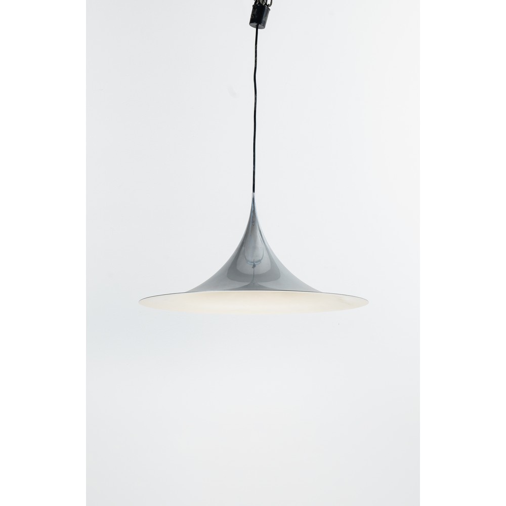 Lampada a sospensione ad una luce modello “Gubi”, diffusore a campana in alluminio cromato e verniciato bianco.