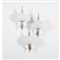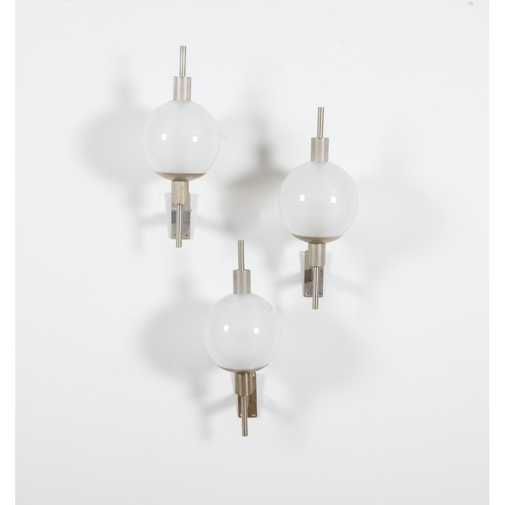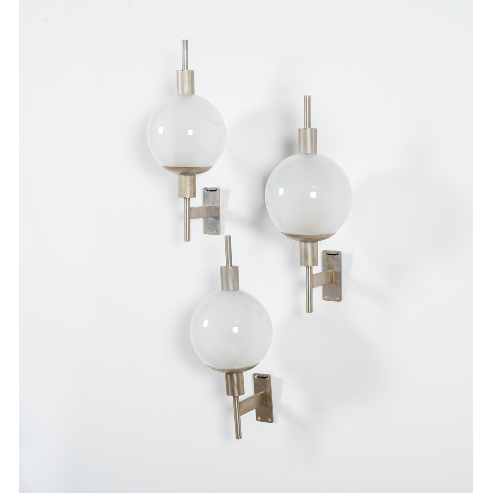 Tre lampade da parete ad una luce, struttura in metallo cromato, diffusore sferico in vetro opalino. Segni di uso.