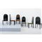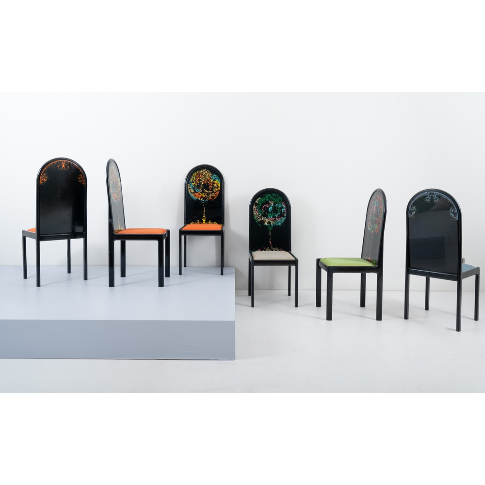 Sei sedie della serie limitata “Quattro punti cardinali”, struttura in legno laccato nero, spalliera con decoro centrale in policromia, seduta con imbottitura e rivestimento in tessuto di diverso colore. Graffi e difetti.