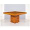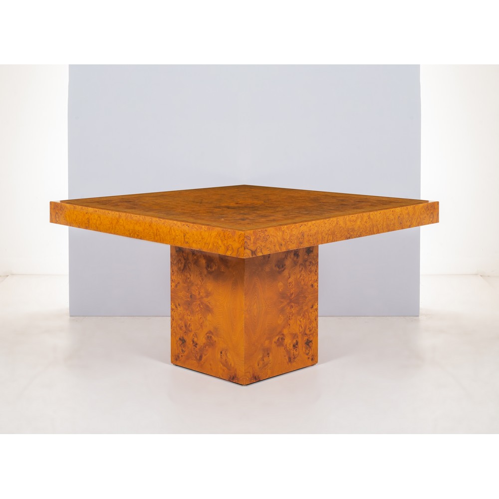 Tavolo da pranzo in radica, piano quadrato con decoro a linee parallele sul piano, base cubica.