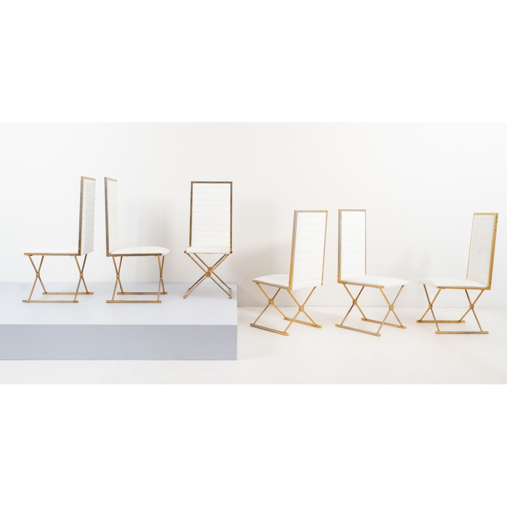 Sei sedie con struttura in ottone, alto schienale, rivestimento in pelle bianca, telo logato Turri.