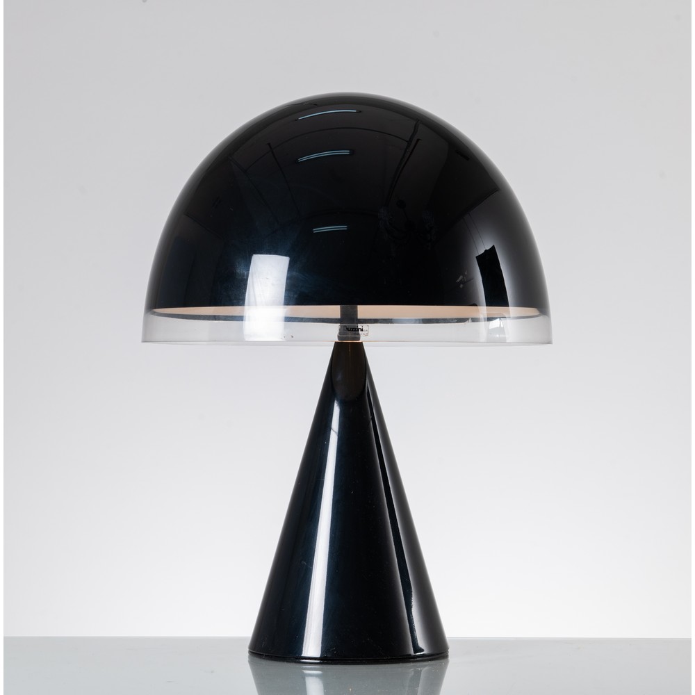 Lampada da tavolo a due luci modello “Baobab”, struttura conica in metallo verniciato nero, diffusore semisferico in metacrilato trasparente. Etichetta di produzione.