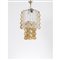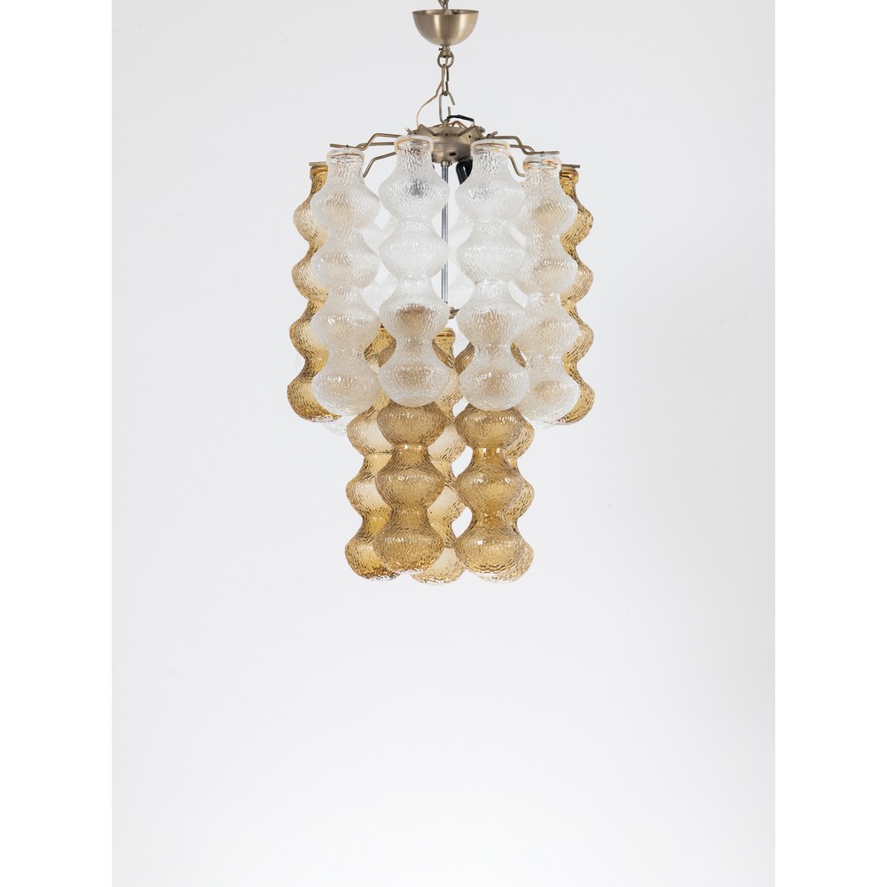 Lampada a sospensione a due luci, struttura in metallo cromato, diffusori in vetro corteccia ad elementi a gocce sovrapposte cave in vetro incolore e ambra.