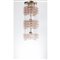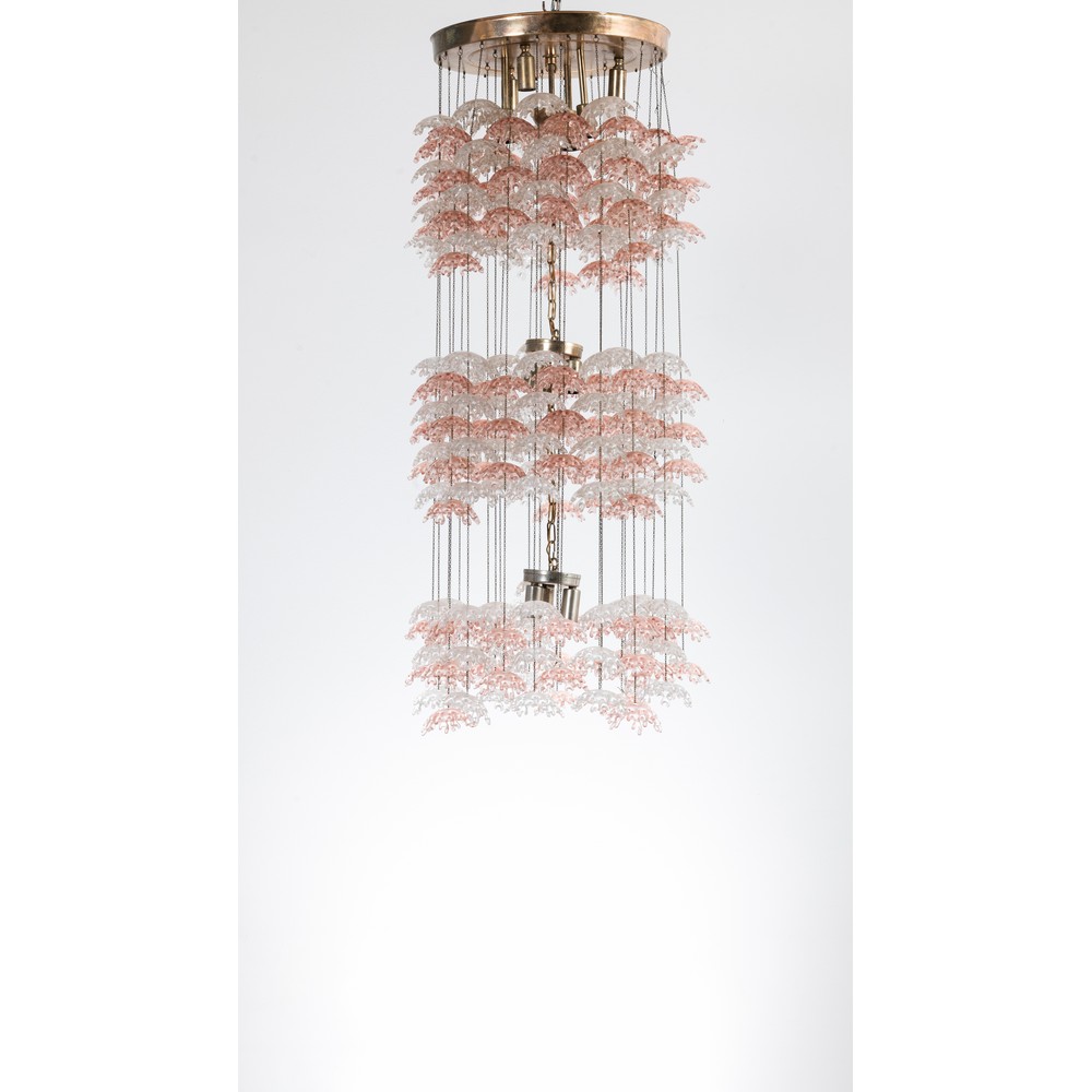 Lampada a sospensione a dodici luci con struttura in ottone, diffusore composto da fiori in vetro di murano incolore e rosa impilati con catenella metallica, corpo cilindrico. Lievi ossidazioni.
