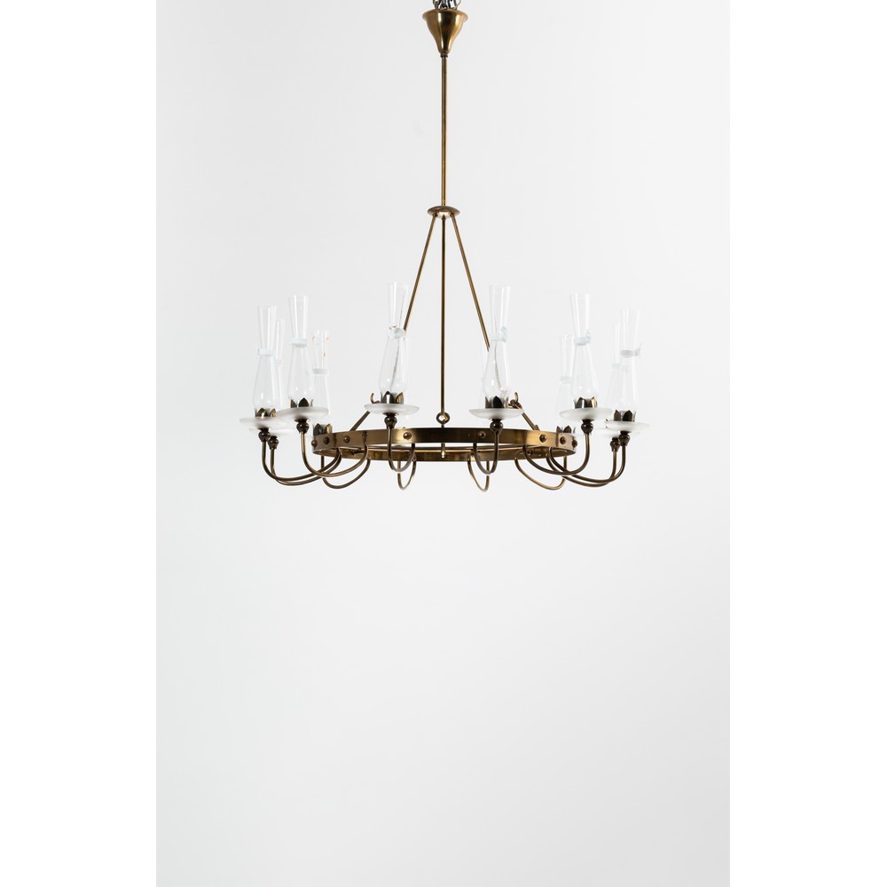 Lampada a sospensione a dodici luci con struttura in ottone, diffusori biconici a goccia in vetro trasparente con fascia di decoro in vetro lattimo, piatti in vetro satinato. Segni del tempo.