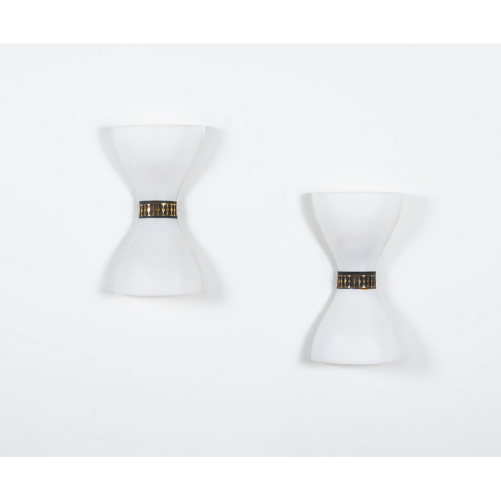 Coppia di lampade da parete biconiche a due luci in metallo laccato bianco, corpo a clessidra, giunto in metallo laccato nero e ottone traforato. Ossidazioni.
