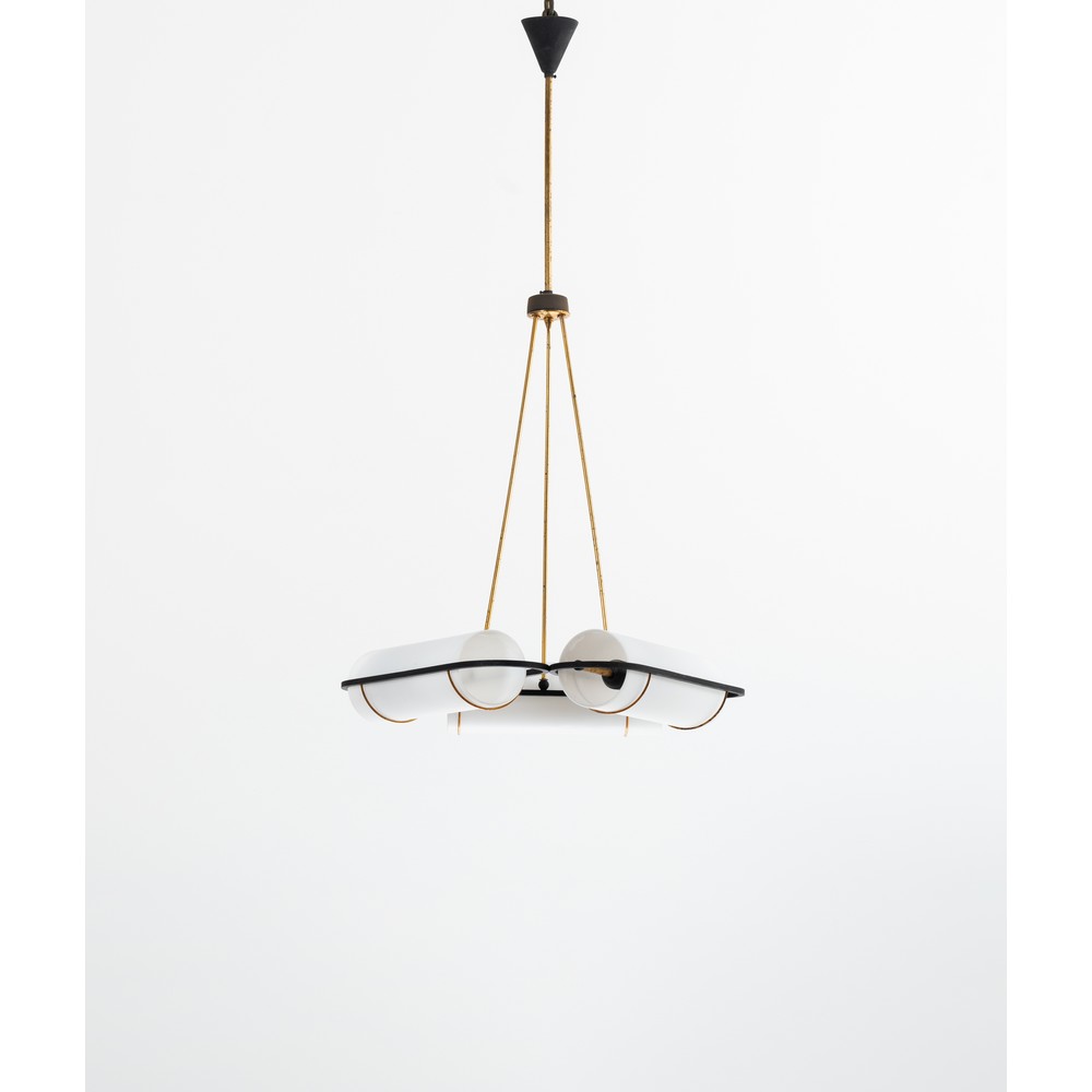 Lampada a sospensione a tre luci, struttura in metallo dorato e verniciato nero, diffusori cilindrici in vetro opalino. Lievi ossidazioni.