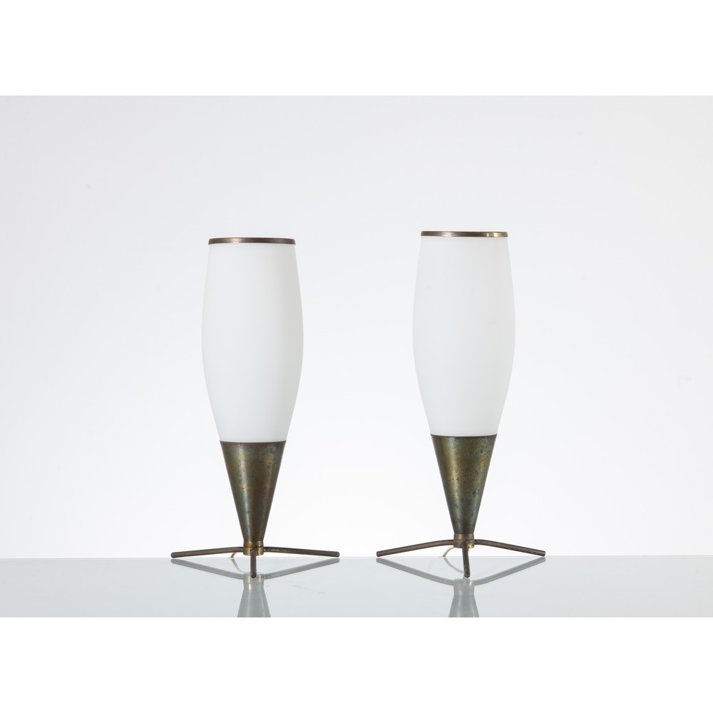 Coppia di lampade da tavolo ad una luce, struttura in ottone con piede tripode, diffusore a goccia in vetro opalino bordato in ottone, impianto elettrico originale. Lievi ossidazioni.