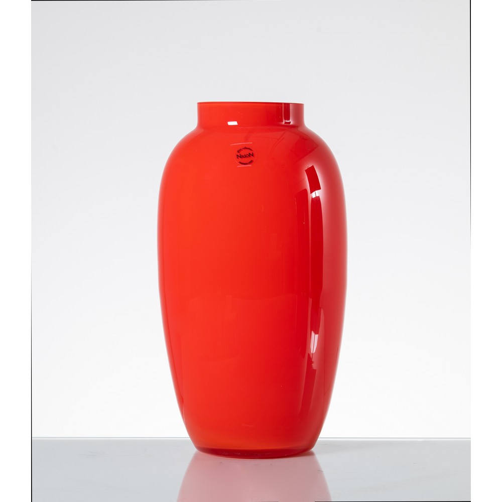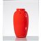 Vaso in vetro rosso, corpo ovalizzato, largo e basso collo, bocca piana circolare. Etichetta di produzione.
