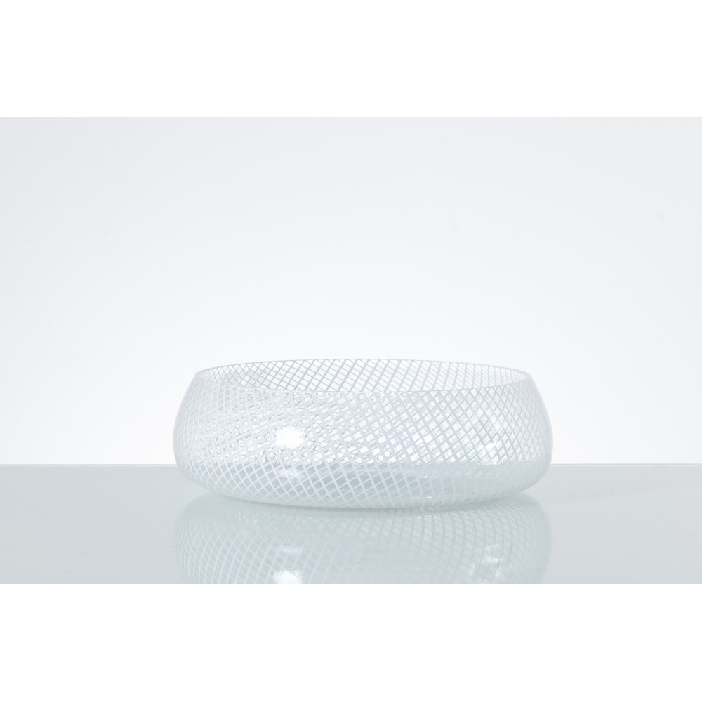 Centrotavola in vetro incolore e lavorato a mezza filigrana lattima, corpo circolare con bocca piana.