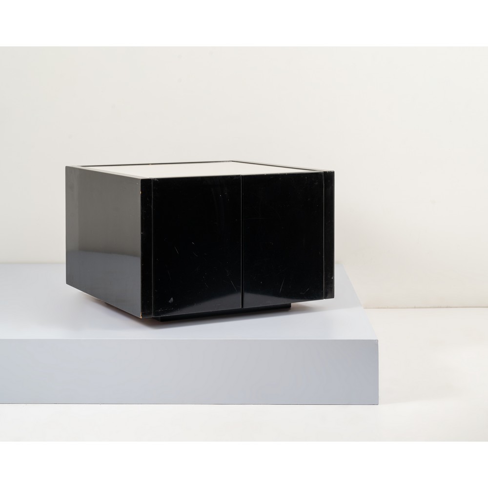 Mobile bar della serie “Saratoga”, struttura in legno laccato nero, corpo cubico, su un fianco un vano con tre spazi chiuso da due ante a battente. Usure e difetti alle parti laccate.