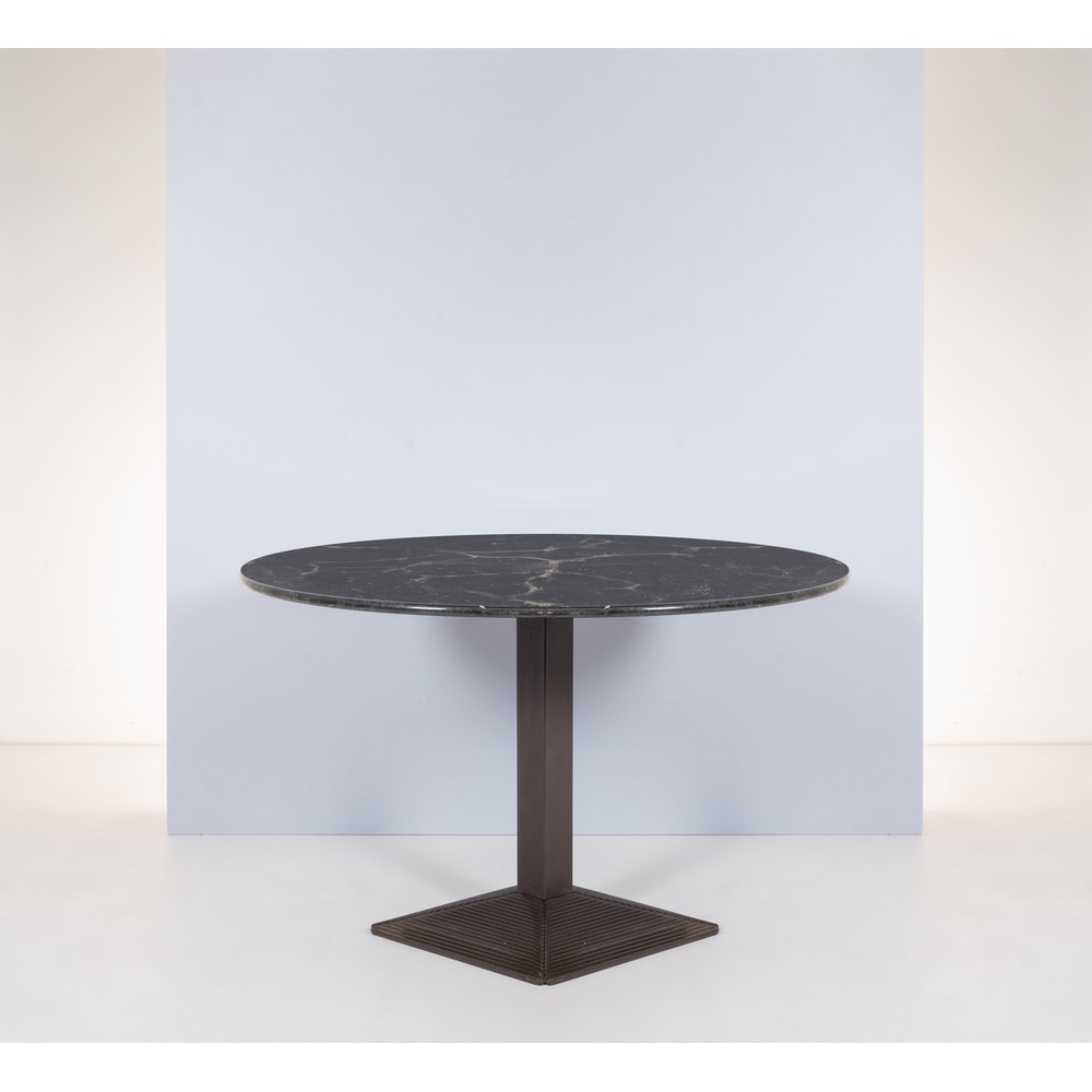Tavolo da pranzo con base in ghisa, gamba centrale in metallo laccato nero, piano in marmo nero marquina. Difetti al marmo.