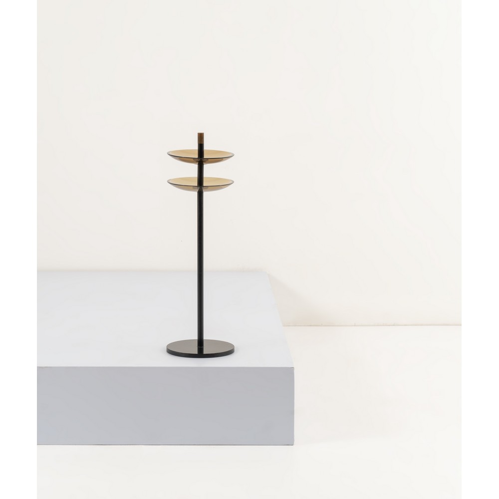 Posacenere da terra modello “2087” con struttura in ottone tubolare verniciato nero, due coppe in cristallo fumè, finale in ottone bacchettato.