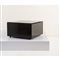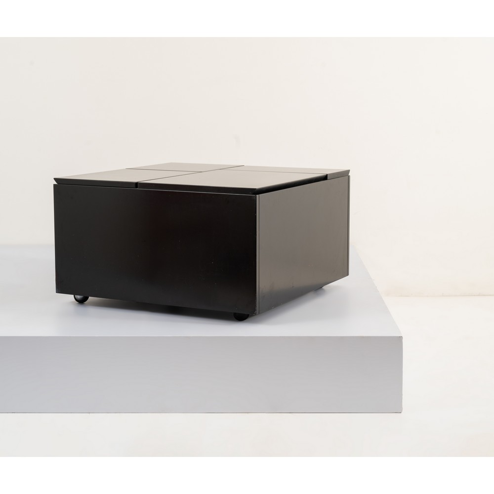 Mobile bar in legno laccato nero, corpo cubico con piano quadrato, vani superiori apribili.