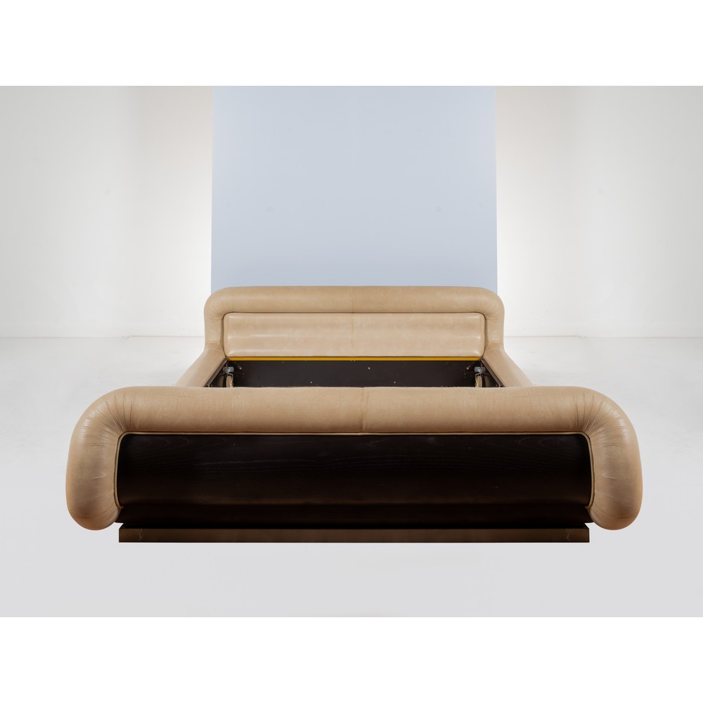 Letto matrimoniale della serie "UMA". Alluminio spazzolato, legno esotico, pelle imbottita color avorio, legno ebanizzato.
