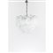 Lampada a sospensione a sei luci, struttura in metallo cromato, diffusore troncopiramidale composto da elementi modulari a calza sagomata in vetro incolore corteccia, impianto elettrico originale. Un elemento mancante ed uno con rottura.
