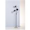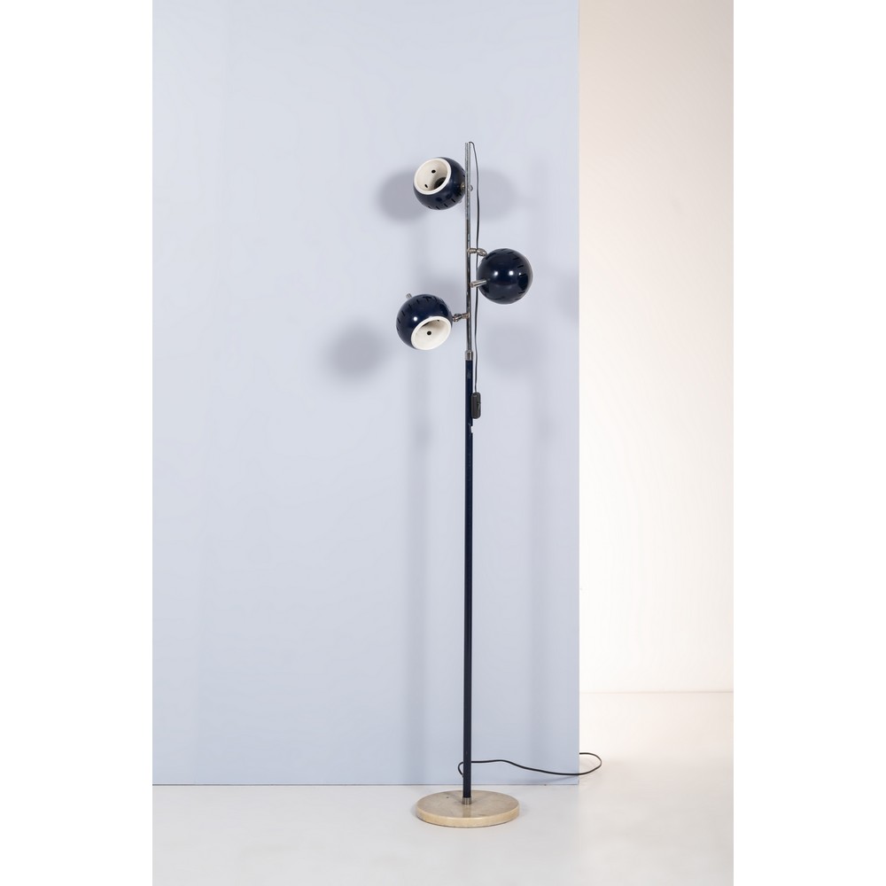 Lampada da terra a tre luci, struttura in metallo verniciato blu con in metallo cromato, diffusori globulari orientabili in metallo verniciato blu e bianco, metallo cromato, base circolare in marmo bianco di Carrara.