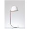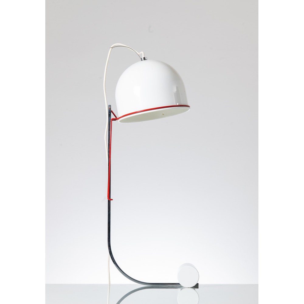 Lampada da tavolo ad una luce modello "Ofelia" in metallo verniciato bianco, braccio curvato in acciaio cromato, diffusore semisferico rotante in metallo verniciato bianco e rosso. Marchio di produzione. Segni di uso.