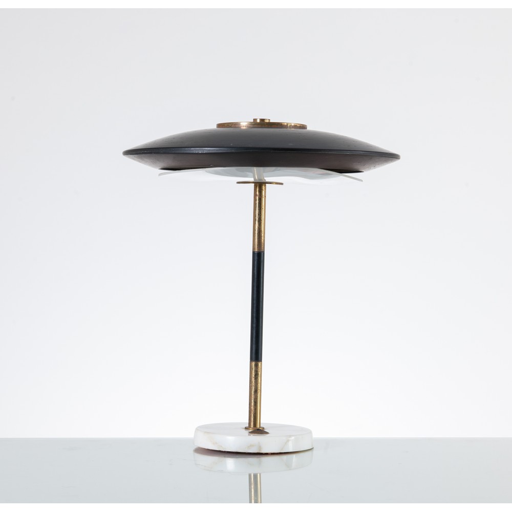 Lampada da tavolo a due luci con struttura in metallo verniciato nero ed ottone, diffusore a disco in metallo verniciato nero e opale bianco, base circolare in marmo di Carrara. Ossidazioni e segni di uso.