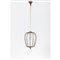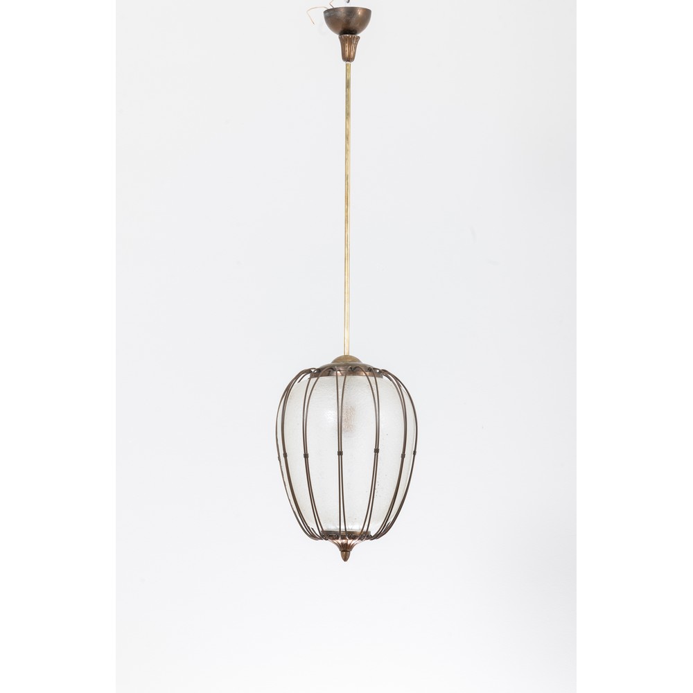Lampada a sospensione ad una luce con struttura in ottone e metallo laccato e diffusore in vetro satinato decorato con stecche in ottone.