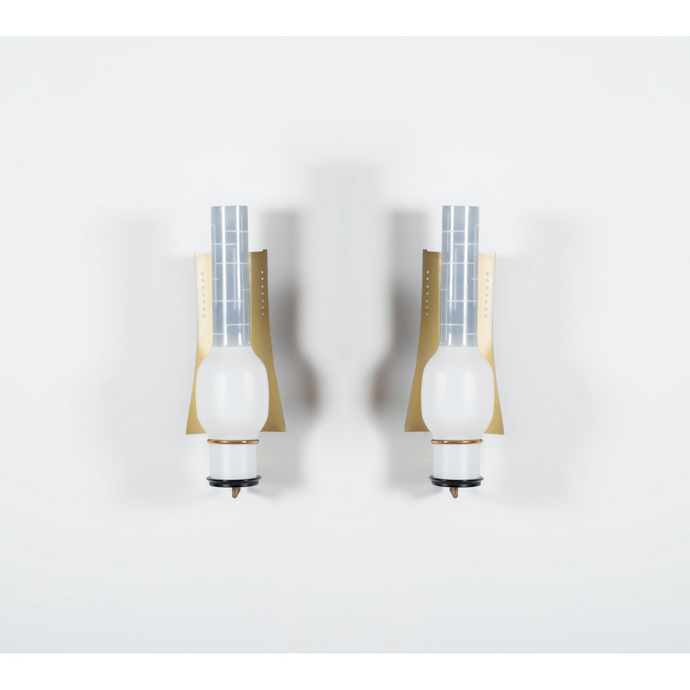 Coppia di lampade da parete ad una luce, struttura in ottone, metallo verniciato bianco, alluminio dorato curvato e forato, diffusore ovalizzato con canna cilindrica in vetro opalino con decori lineari grigi e bianchi.