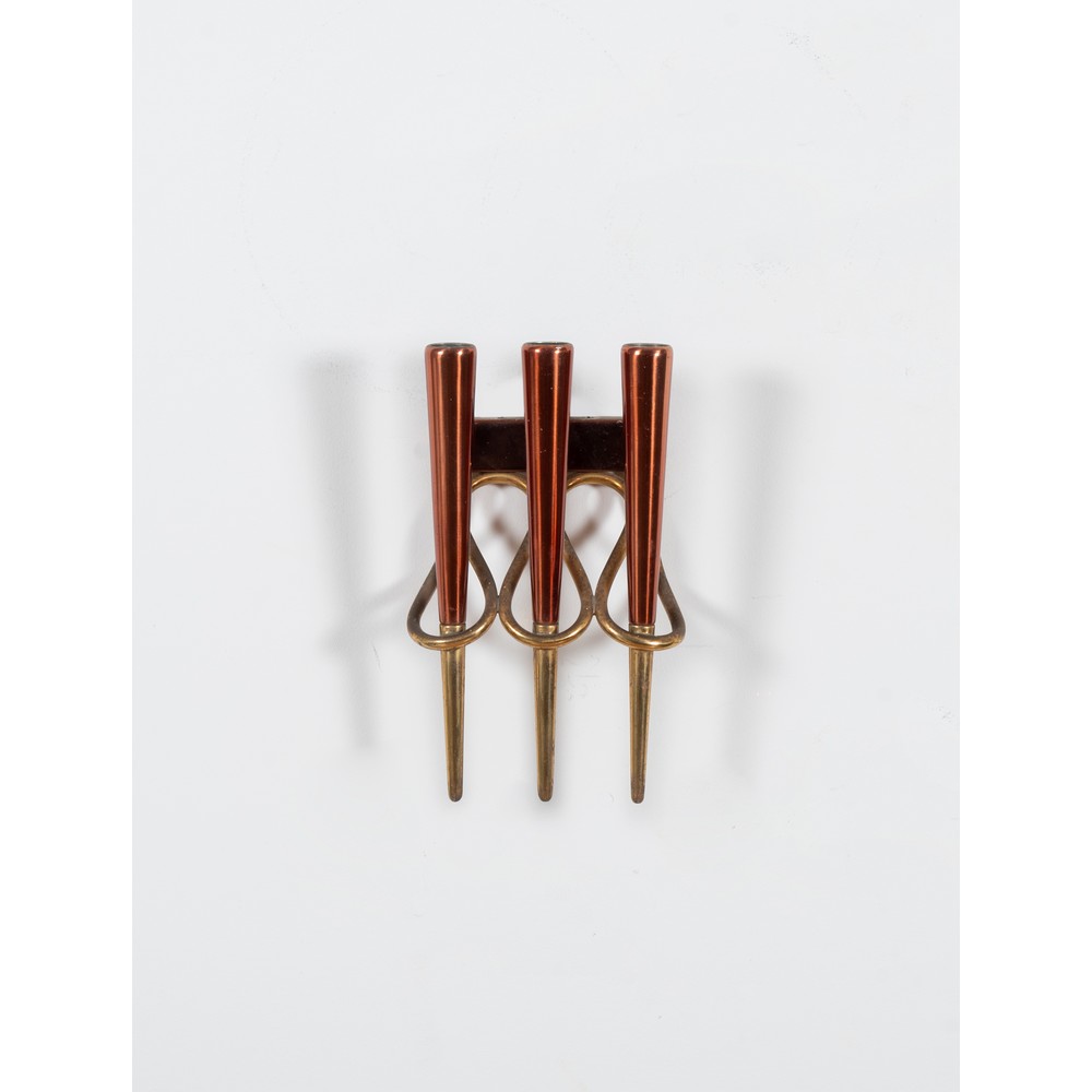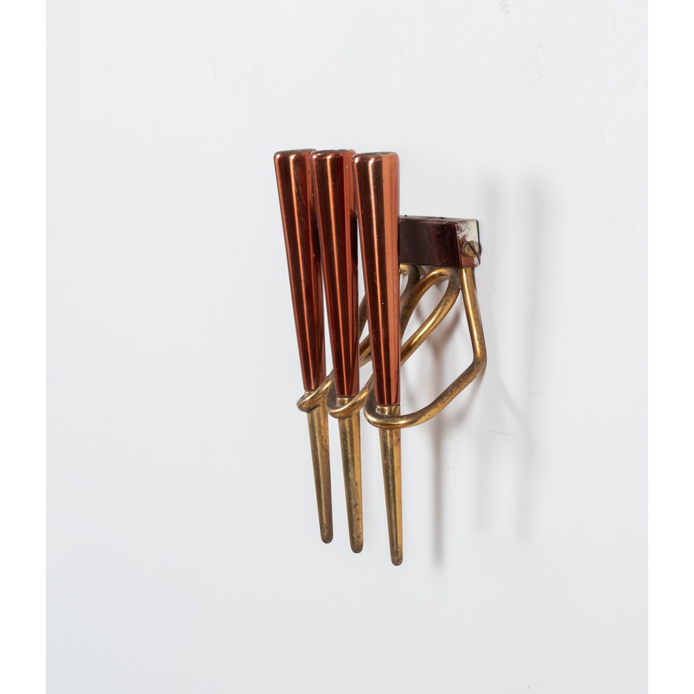 Applique a tre luci, struttura in tubolare di ottone curvato, diffusori conici in ottone e metallo cromato rosso.