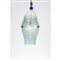 Lampada a sospensione ad una luce in vetro acquamarina a bollicine, corpo cilindrico sagomato lievemente rigonfio al centro, tre pastiglie in vetro sui fianchi ed una sfera superiore, coppa in metallo.