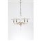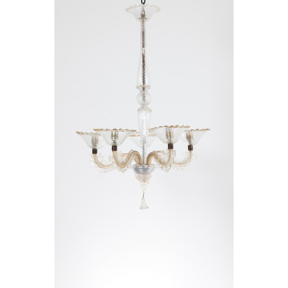 Lampada a sospensione a cinque luci in vetro incolore e pagliesco, struttura in metallo, bracci ricurvi tortili con foglie pizzicate applicate, coppe in vetro rigadin incolore con bordo pizzicato pagliesco, elementi del fusto in vetro soffiato, giunti in ottone.