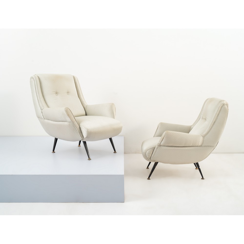 Coppia di poltrone, struttura in legno, imbottitura e rivestimento in tessuto originale verde con punteggiatura bianca, piede conico in metallo verniciato nero e ottone. Segni di uso.