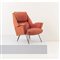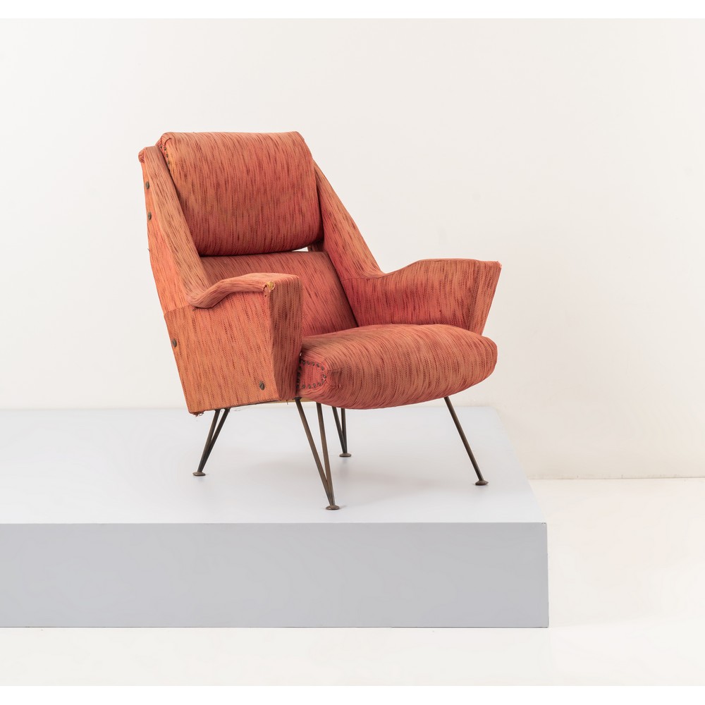 Poltrona con doppio schienale, struttura in legno con imbottitura e rivestimento con tessuto originale nei toni del rosso, minuterie in ottone, piede in metallo verniciato nero, usure al tessuto e alla vernice dei piedi