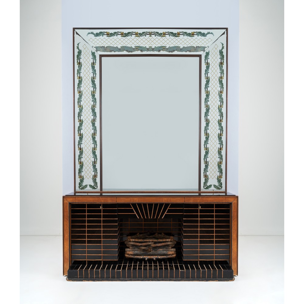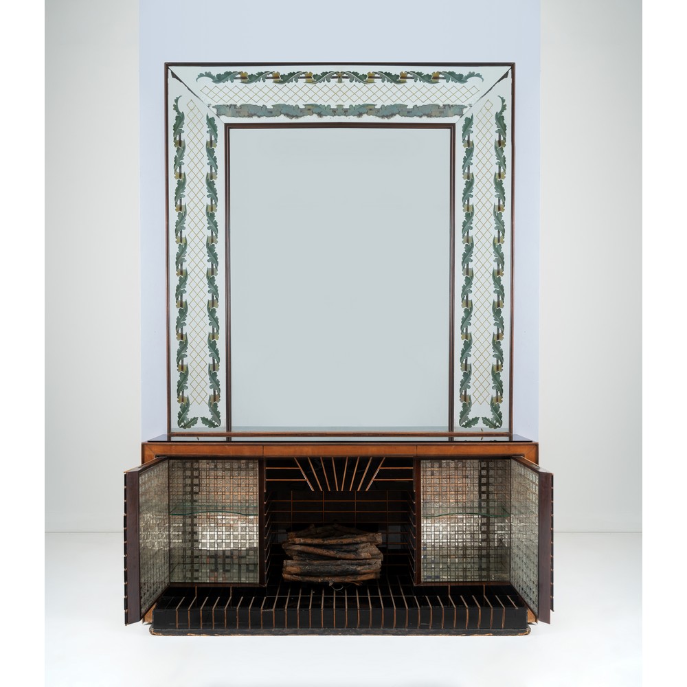 Mobile bar o contenitore con fronte a forma di camino decorato da piastrelle in vetro di Murano opalino nero e fugate in legno di acero, due vani con ante battenti e specchiati all’interno, finta legna e illuminazione interna. Uno specchio sovrastante in cristallo specchiato e decorato con motivi geometrici e foglie verdi. Usure e lievi difetti.