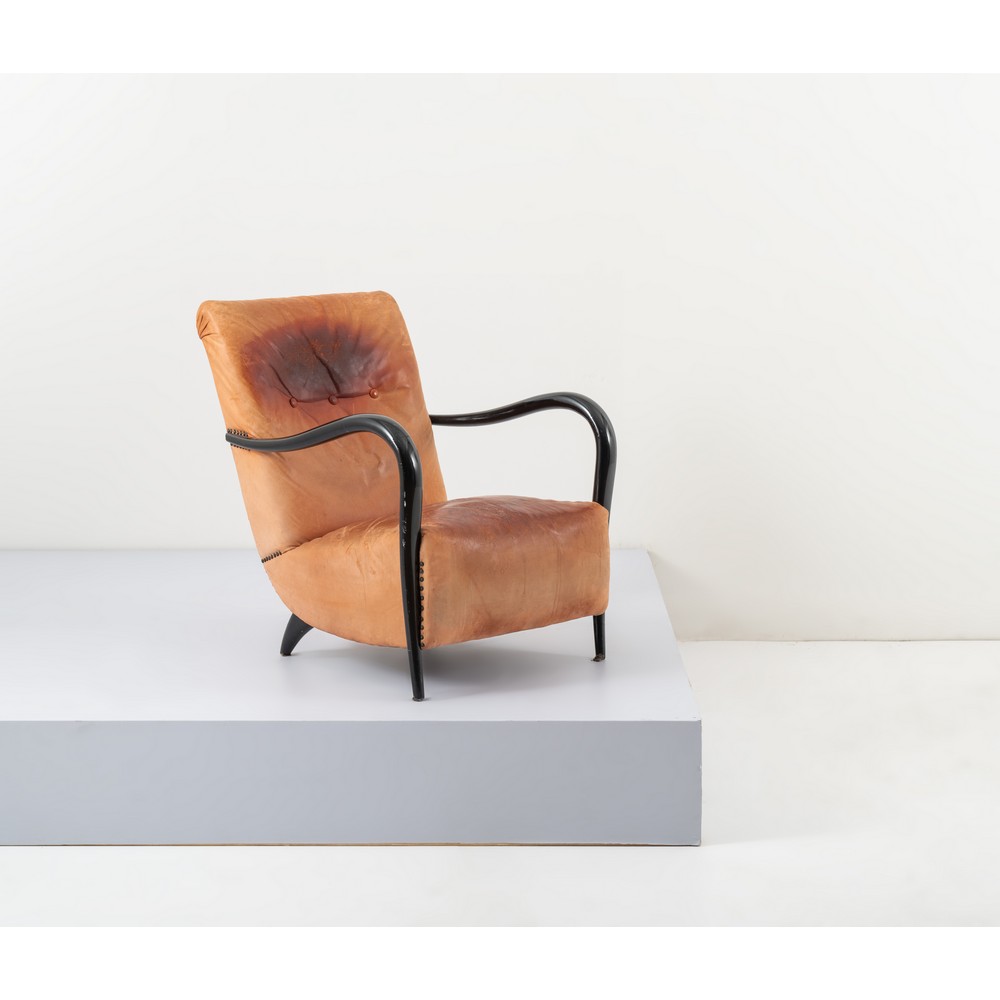Poltrona con struttura in legno sagomato ed ebanizzato, spalliera e seduta con imbottitura e rivestimento in pelle cognac. Segni di uso e aloni.