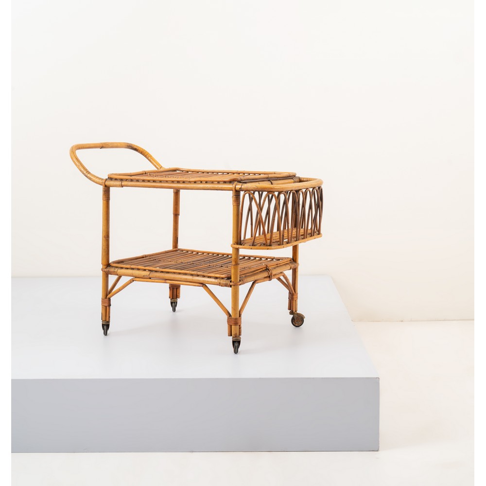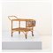 Carrello con struttura in canna di bamboo, midollino, due piani rettangolare in canna di bamboo, vano anteriore porta bottiglie, ruote in metallo.