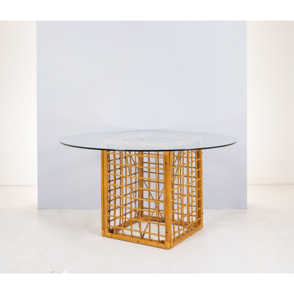Tavolo da pranzo con piede parallelepipedo in canna di bamboo e midollino, piano circolare in cristallo incolore.