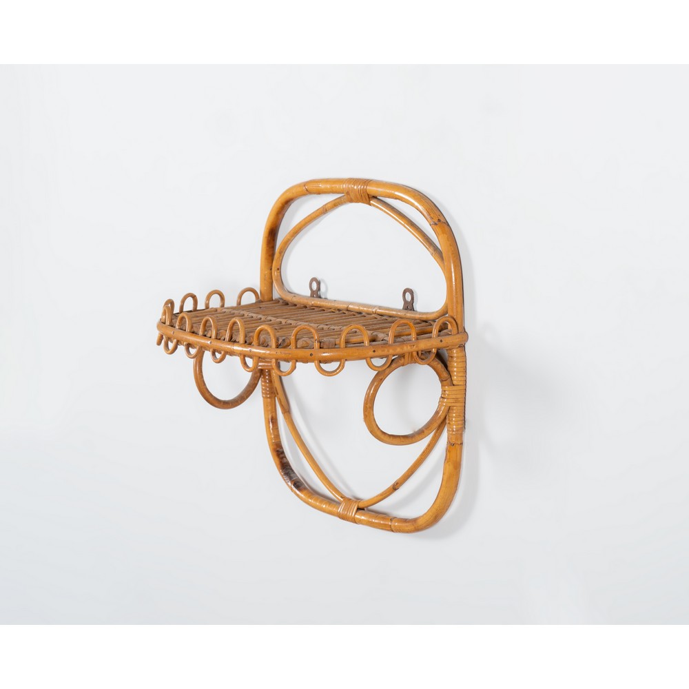 Etagere/mensola in canna di bamboo curvata e midollino, ganci metallici.