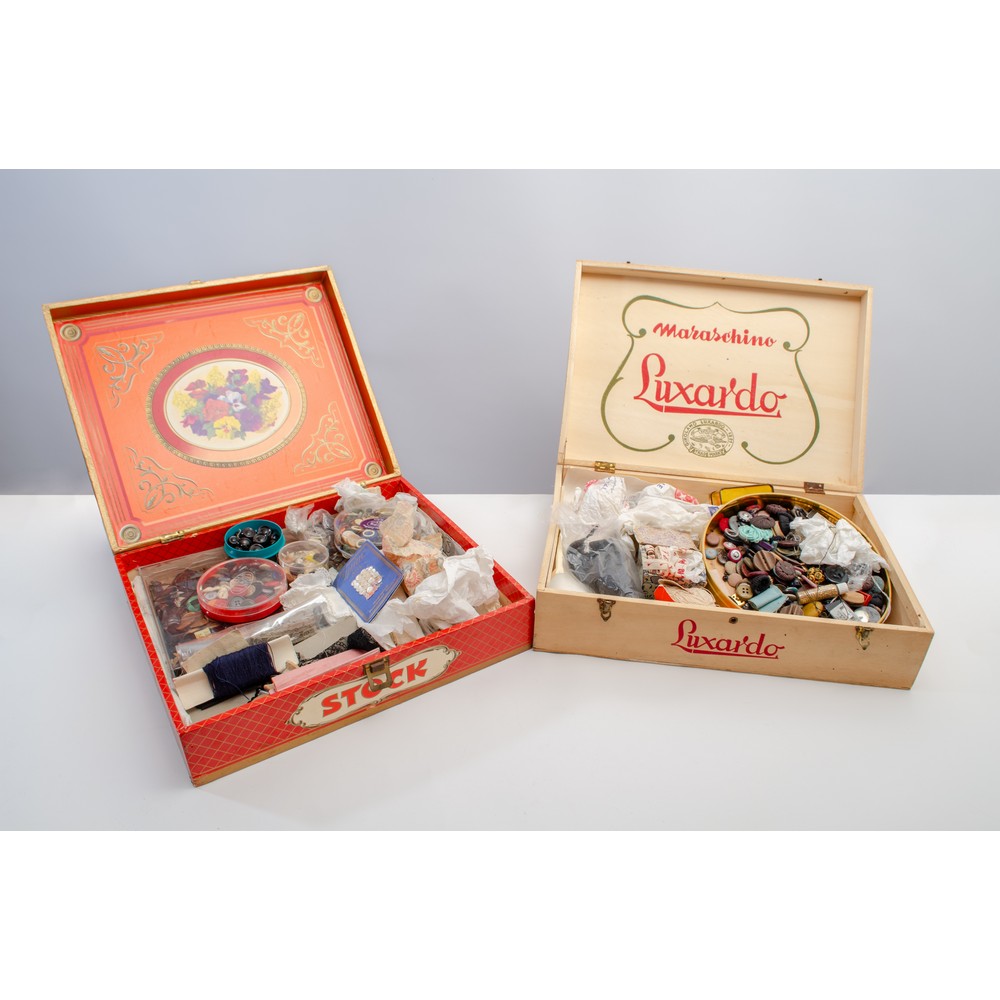 Due scatole contenenti collezioni di antichi bottini di differenti dimensioni, materiali e colori; occorrente per il cucito, fiocchi, fibbie, fili di cotone e cucito, bottoni a pressione, passamanerie.