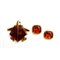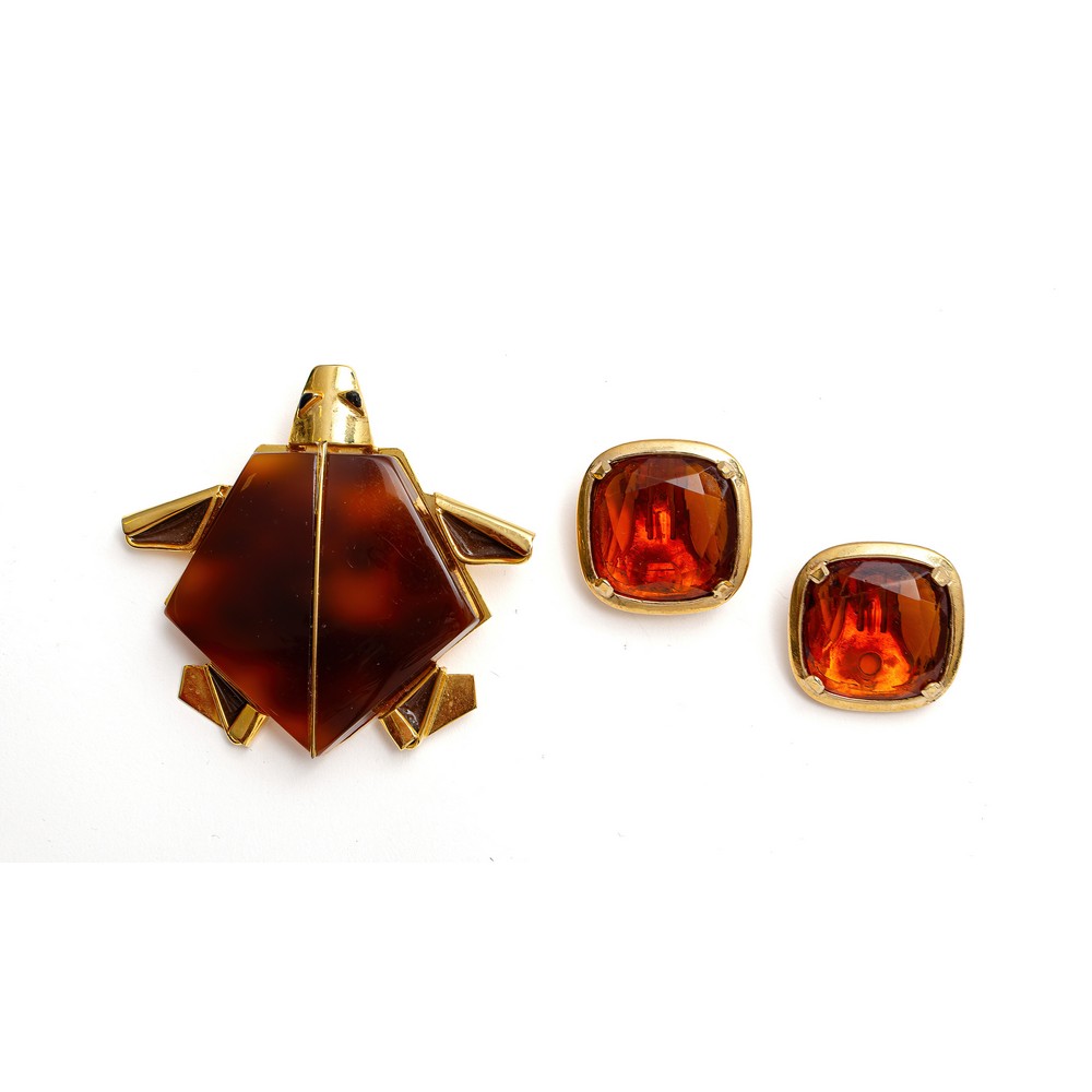 Spilla "Tartaruga" con montatura in metallo dorato, guscio in bachelite a finta tartaruga, occhio con smalti neri. Marchio di produzione incusso. Orecchini a bottone quadrati con montatura in metallo dorato, pietra sfaccettata color ambra, chiusura a clips. Marchio di produzione.