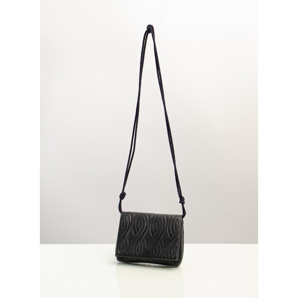 Borsa a spalla in vitello blu decorata in superfice con disegni ondulati, minuterie in metallo dorato, logo sulla parte interna della patta, tracolla in cordoncino di raso blu. Marchio di produzione.