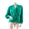 Giacca in seta verde smeraldo con bottoni logati dorati, arricciatura elastica sui fianchi, monogramma ricamato sul fronte. Taglia 42. Etichetta di produzione.
