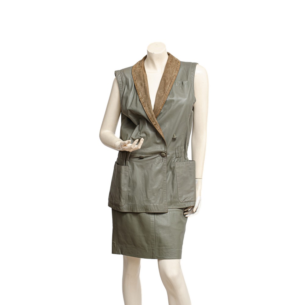 Completo in pelle e camoscio color verde salvia composto da gilet monopetto, collo lievemente sciallato, due tasche frontali, piccola tasca sulla spalla, elastico alla vita; gonna corta al ginocchio taglio retto. Etichetta di produzione.