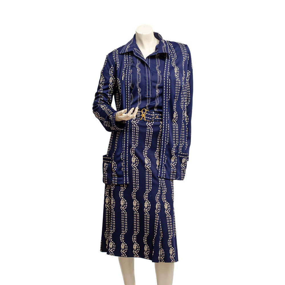 Completo composto da giacca blu con decoro a logo Roberta Di Camerino panna, maniche lunghe, collo sciallato, apertura sul davanti, ganci di chiusura; camicia a maniche lunghe, aperta per metà sul fronte, bottoni logati in metallo dorato; gonna retta con pieghe laterali, cintura con logo dorato Roberta Di Camerino. Etichetta di produzione. Taglia 48.