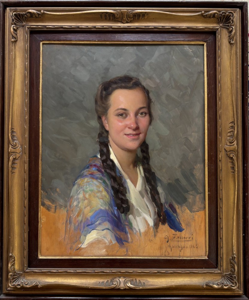Arturo Zanieri Firenze 1870 - 1955 Maccagno Popolana a maccagno Olio su tavola cm 45x59 firmato in basso a dx datato 1945