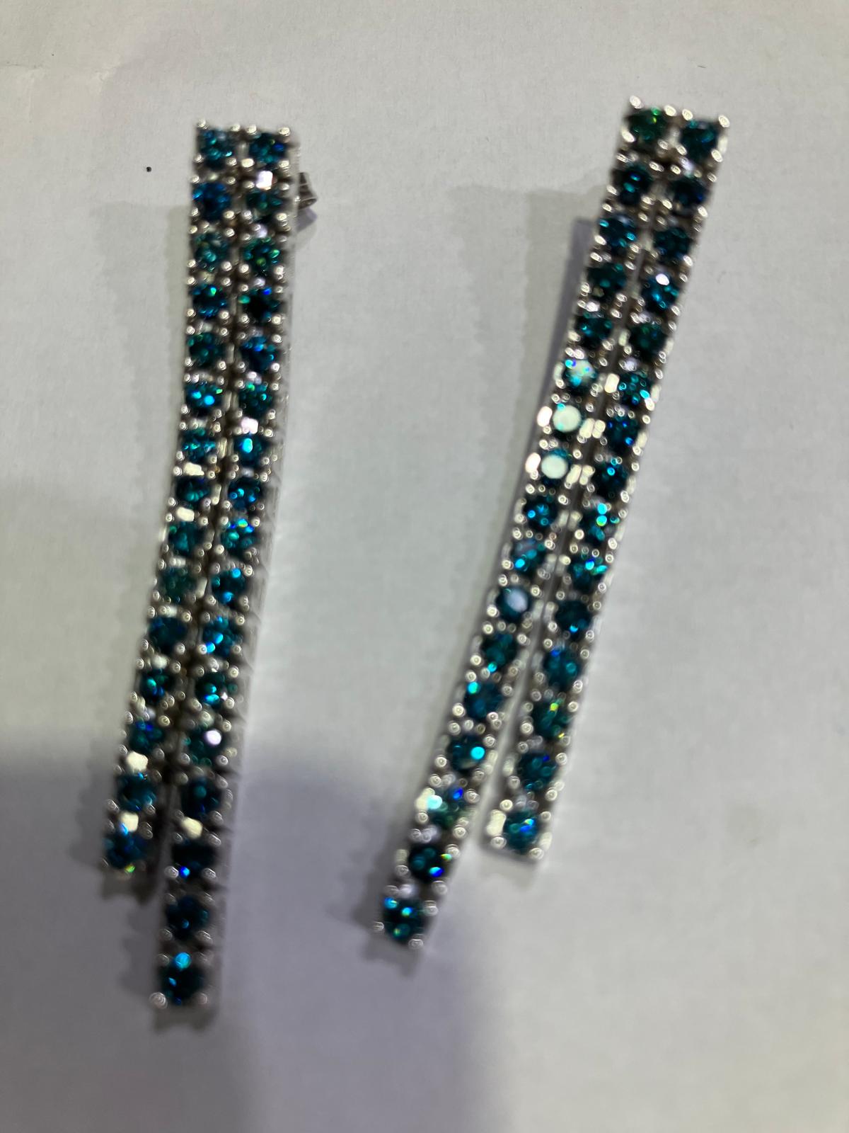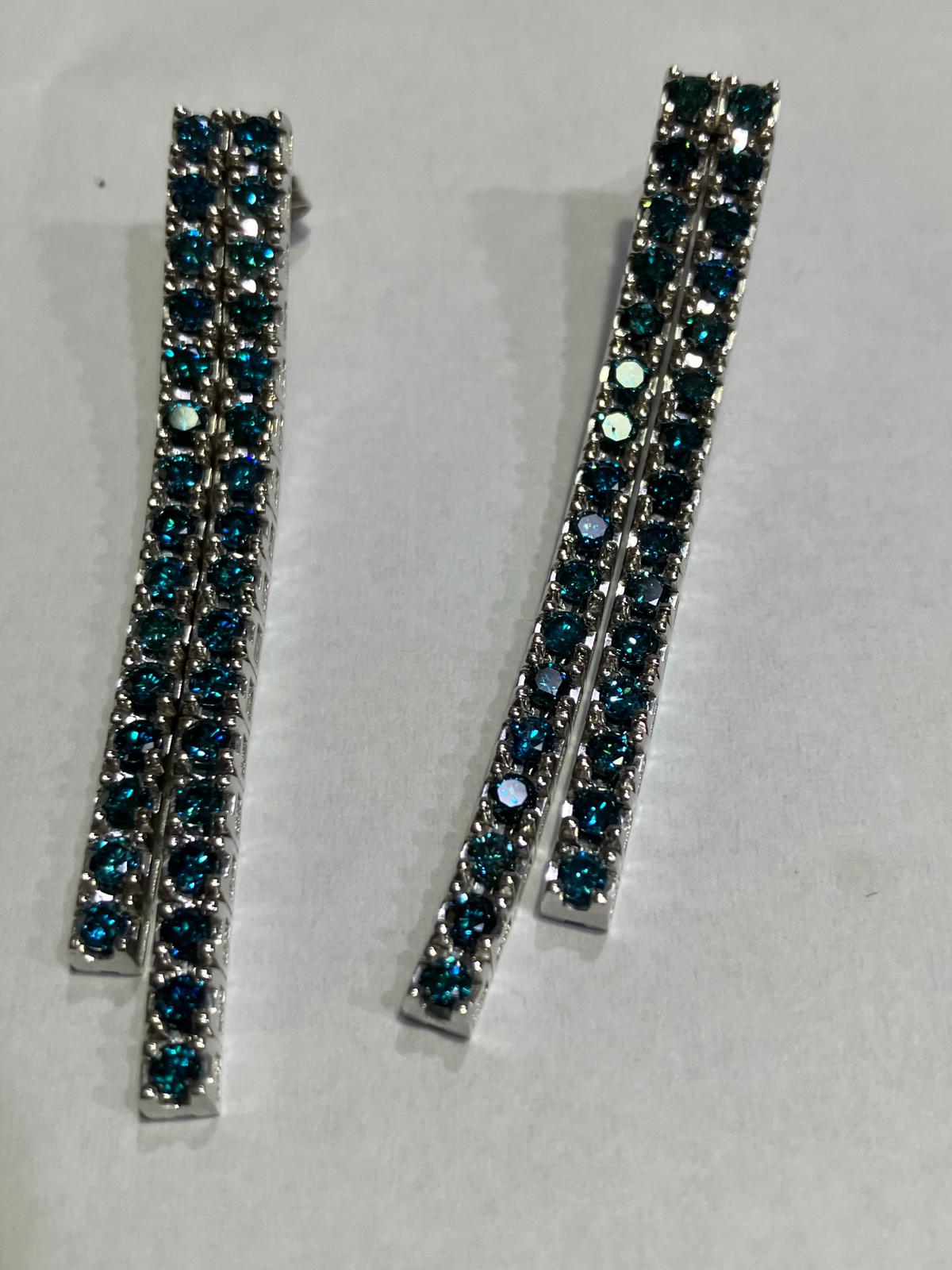 Coppia di orecchini modello tennis, in oro bianco 18 ct, per un peso di gr10,00 interamente percorsi da brillanti blu per totali 3,50 carati