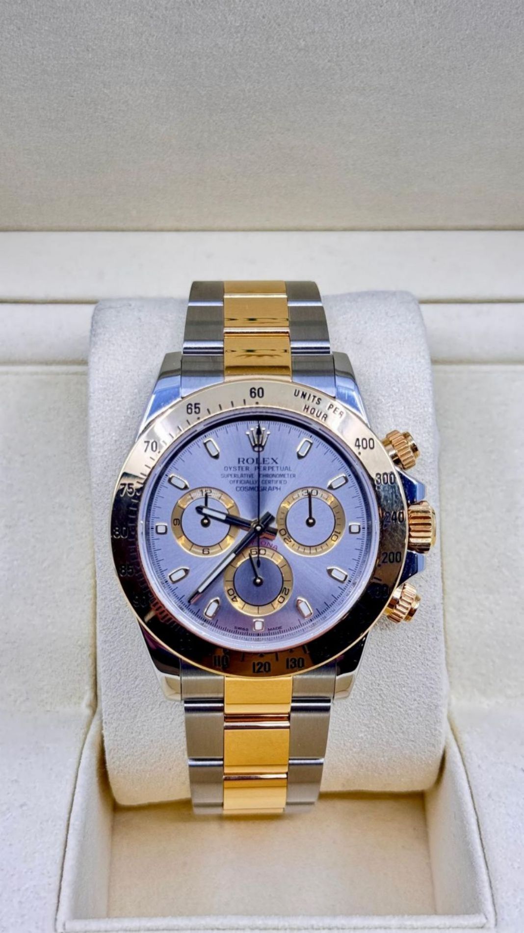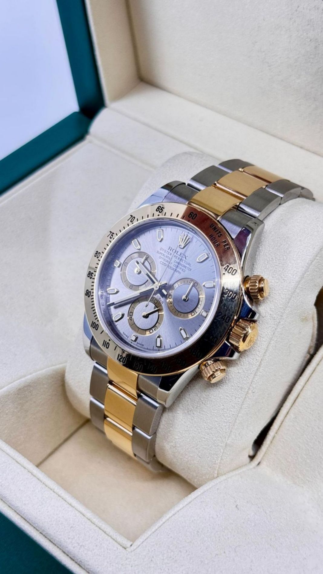 Marca Rolex Modello (Orologio) Daytona Numero di referenza 116523 Carica Automatico Materiale della cassa Oro/Acciaio Materiale cinturino Oro/acciaio Anno 2010 documenti originali Rolex, no box, la scatola viene utilizzata solo per fotografie non è in vendita Calibro Carica Automatico Cassa Materiale della cassa Oro/Acciaio Diametro 40 mm Impermeabile 10 ATM Materiale lunetta Oro giallo Vetro Vetro zaffiro Cinturino Materiale cinturino Oro/acciaio Colore cinturino Oro/acciaio Chiusura Déployante Materiale chiusura Oro/Acciaio Funzioni Cronografo