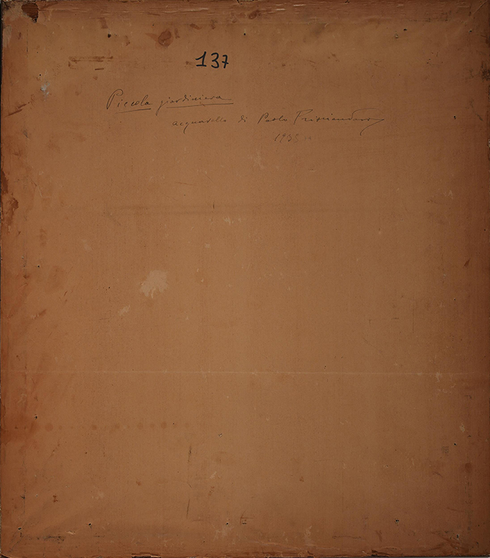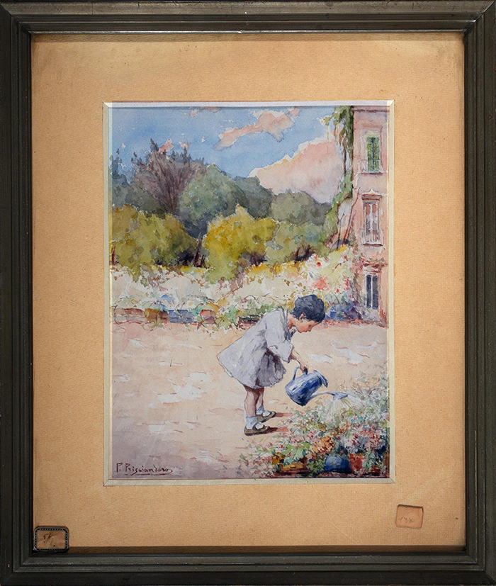 Prisciandaro Francesco Paolo (Terlizzi 1874 - Napoli 1946) Piccola giardiniera acquerello su carta, cm 35x26,5 firmato in basso a sinistra: P. Prisciandaro a tergo iscritto: Piccola giardiniera, acquerello di Paolo Priscandaro 1939