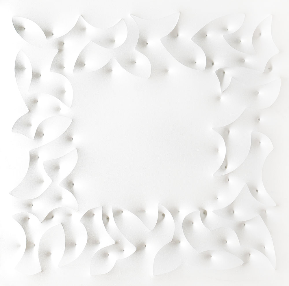 tela estroflessa bianca cm. 80x80x4, firma, titolo ed etichetta della Galleria DZ Nuovo Segno al retro, dichiarazione d'autenticità dell'artista su foto, opera priva di cornice.