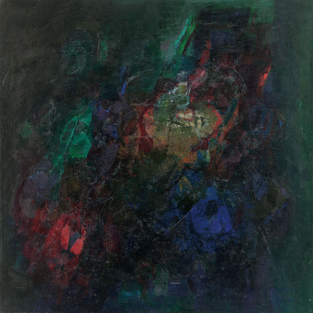 olio su tela cm. 105x110, firma e anno in basso a destra, etichetta della Galleria Penelope (Roma) e della collezione Jack Palance (Beverly Hills - California) al retro.