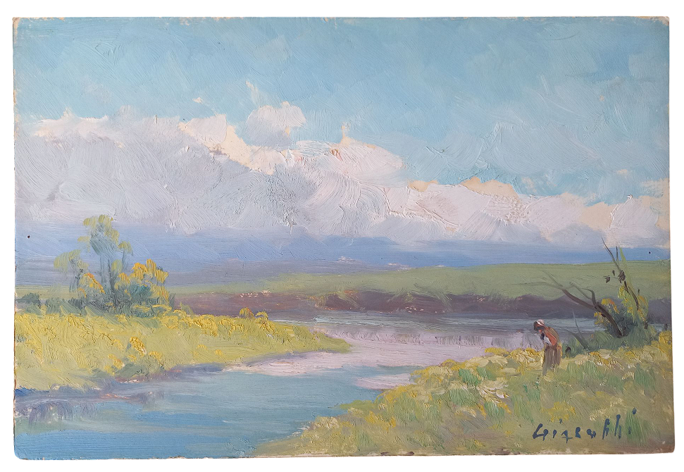 Ernesto Giacobbi (1891-1964) - Paesaggio con figura- olio su cartone cm.20x30 firmato in basso a destra senza cornice