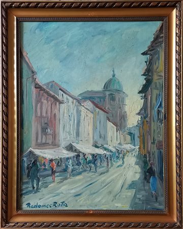Radames Rota (sec.XX) - Scorcio cittadino con mercato - olio su faesite cm.74x57 firmato in basso a sinistra
