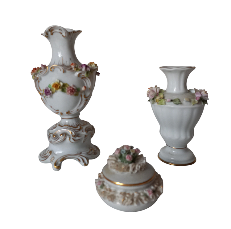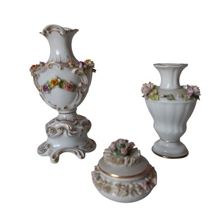 Due vasetti e una scatolina in porcellana con fiori a rilievo h.max cm.17 -...